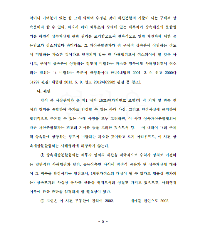 의뢰인은 채무자인 오빠와 상속재산분할협의를 하여 피상속인의 부동산 지분 전부를 취득하였는데 그 이유는 의뢰인이 피상속인 생전에 특별한 기여를 했기 때문이었습니다. 그런데 원고는 위 협의가 사해행위에 해당한다며 소송을 제기하였고 의뢰인은 저를 찾아오셨습니다.