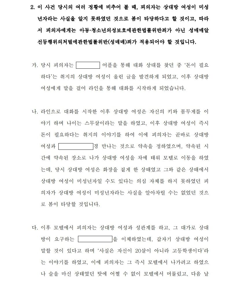 - 이 사건에서 의뢰인분께서는 회사 등의 문제로 반드시 기소유예 처분을 받으셔야 하는 상황이었는데, 만약 상대방이 미성년자임을 몰랐다는 사실이 받아들여지지 않을 경우에는 처벌을 면할 수 없는 상황이었기 때문에 의뢰인분의 진술과 당시의 정황 등을 바탕으로 '당시 피의자(의뢰인)가 상대 여성과 성매매를 한 것은 맞지만, 상대방 여성이 미성년자라는 사실은 인지하지 못하였던 것으로 봄이 타당하다'는 취지의 변호인 의견서를 작성하여 제출하였습니다.