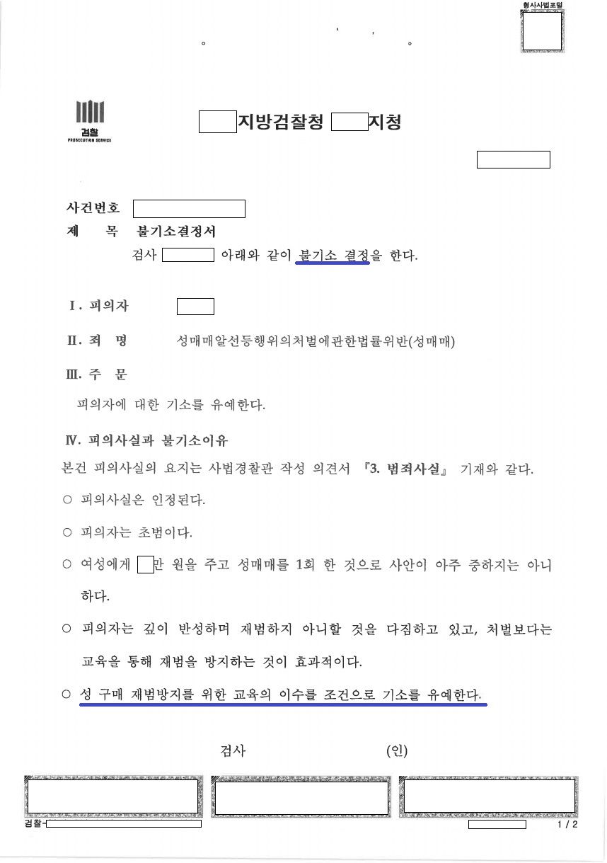 이 사건 담당 검사는 변호인의 의견을 받아 들여 '피의자(의뢰인)가 당시 상대방 여성이 미성년자라는 사실을 인지하지 못하였던 것으로 보인다'는 판단을 하였고, 이와 같은 판단을 바탕으로 의뢰인을 성매매알선등행위의처벌에관한법률위반(성매매)죄로 의율한 뒤 의뢰인에게 교육이수조건부 기소유예 처분을 내렸습니다.