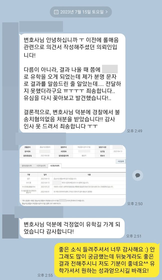 가. 의뢰인은 경찰 조사는 혼자 받고 변호인 의견서만 의뢰를 주셨습니다. 해당 사안은 논리적인 변호인 의견서만으로도 충분히 불송치가 가능하다고 판단하여 의뢰인의 요청을 수락했습니다.