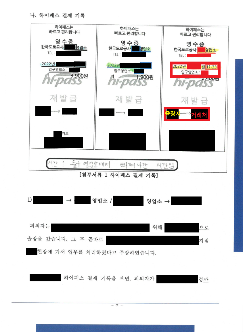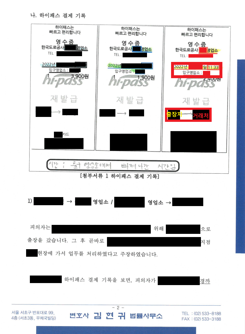 - A의 차량 하이패스 결제기록을 보면 오전 11:33경 ㅇㅇ 고속도로를 통과하였음. (이는 A의 주장대로, 외부 출장 후 거래처는 가는 경로임)