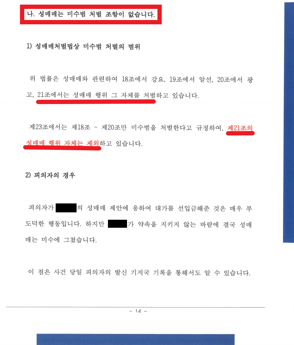 A는 '입금만 했을 뿐, 실제 성관계는 없었다"라고 설명했으나, 수사관은 "B는 무조건 모텔에 남성과 들어가서 성관계를 하기 직전에 입금받았다. 지금 피의자가 2000명이 넘는데, 모두 다 송치되고 있다"라고 말하며 A의 말을 거짓으로 몰아갔습니다. A는 경찰 조사를 앞두고 억울함을 풀고자 저를 선임하였습니다.