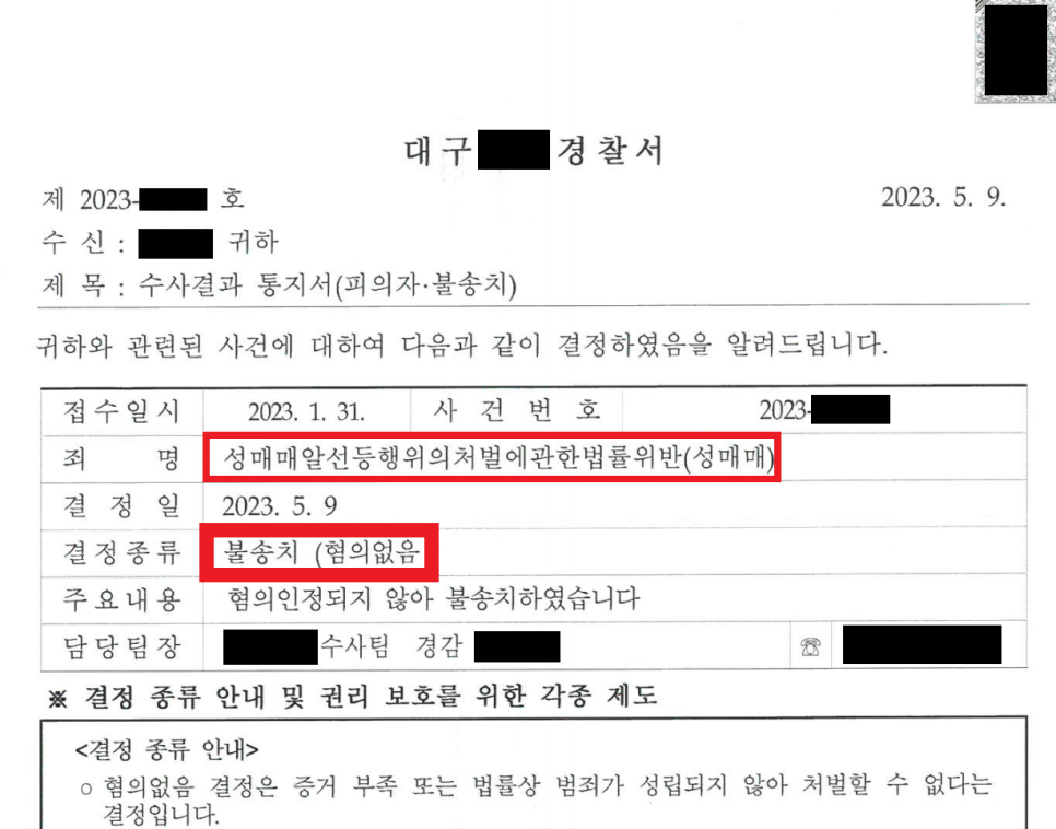 매우 다행히도, 담당 수사관은 1차, 2차 변호인의견서 내용을 읽어본 후, 생각을 완전히 바꾸어 A의 성매매 혐의를 불송치 처분하였습니다.