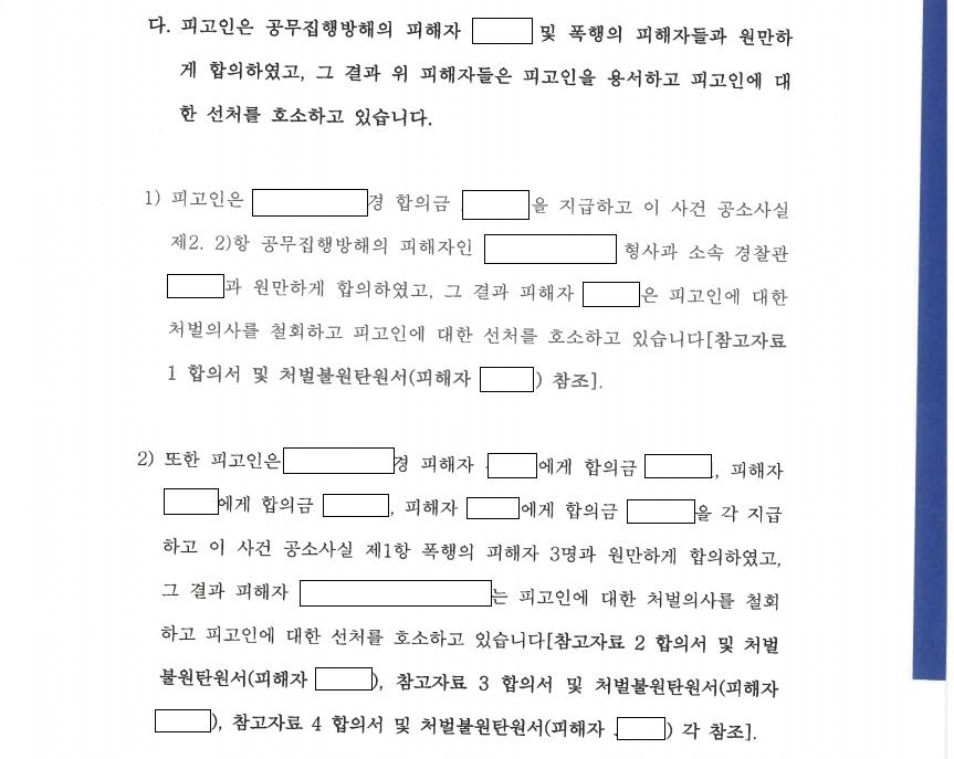 - 또한 의뢰인의 가족분들께서 피해 경찰관분들을 찾아 의뢰인을 대신하여 사과드릴 수 있도록 조력하였고, 이후 직접 피해 경찰관분들에게 연락을 드려 선처를 부탁드리는 등 공무집행방해의 피해 경찰관들과의 합의를 위해서 최선을 다하였고, 결국 피해 경찰관 3명 중 1명과 합의하고, 나머지 피해 경찰관 2명으로부터는 '고생하시는 가족분들을 봐서 합의를 해드리고 싶으나 내부 심의회 결과 합의를 해드릴 수는 없을 것 같다. 유감이다'는 취지의 연락을 받을 수 있었으며, 이후 합의가 이루어지지 못한 피해 경찰관들을 위하여 형사 공탁을 하였습니다.