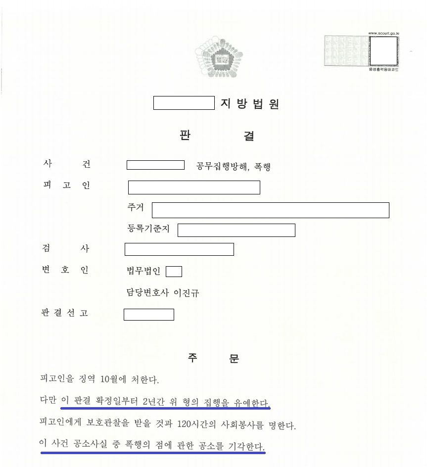 피해경찰관 3명에 대한 공무집행방해, 피해자 5명에 대한 폭행으로 현행범 체포된 이후 구속영장이 발부되어 구속상태에서 수사 및 재판이 진행되던 중 선고기일에 집행유예를 받고 석방된 사건입니다.