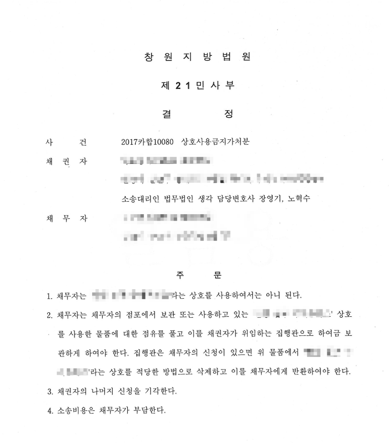위와 같이 상호사용금지 가처분 인용 결정을 받았습니다. 즉 위법하게 우리 의뢰인의 상호를 사용한 상대방에 대하여 더이상 그와 같은 상호를 사용하지 못하도록 금지한 것입니다.