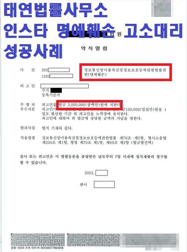뛰어난 수사 전략과 태연법률사무소의 꼼꼼하고 섬세한 진행으로 상대측은 높은 금액의 벌금형이 책정되어 선고됨을 확인하였습니다. 통상 인스타 명예훼손 같은 경우는 벌금형으로 처벌되는 경우가 대부분이지만, 벌금형 또한 전과 기록이 남는다는 점 알아두시길 바랍니다.