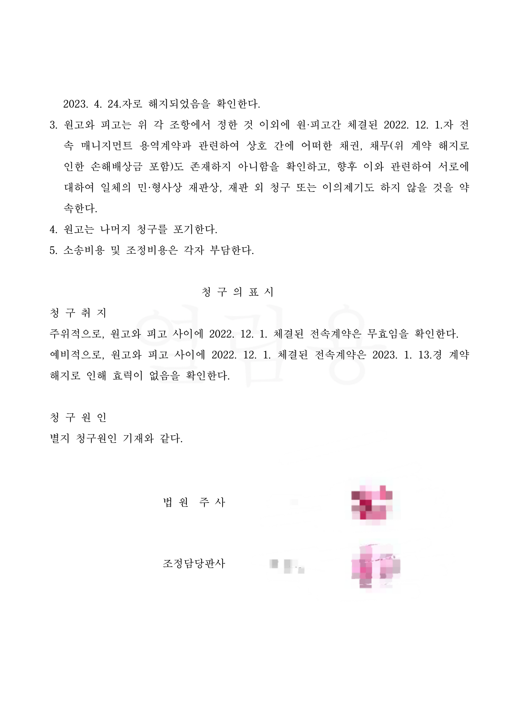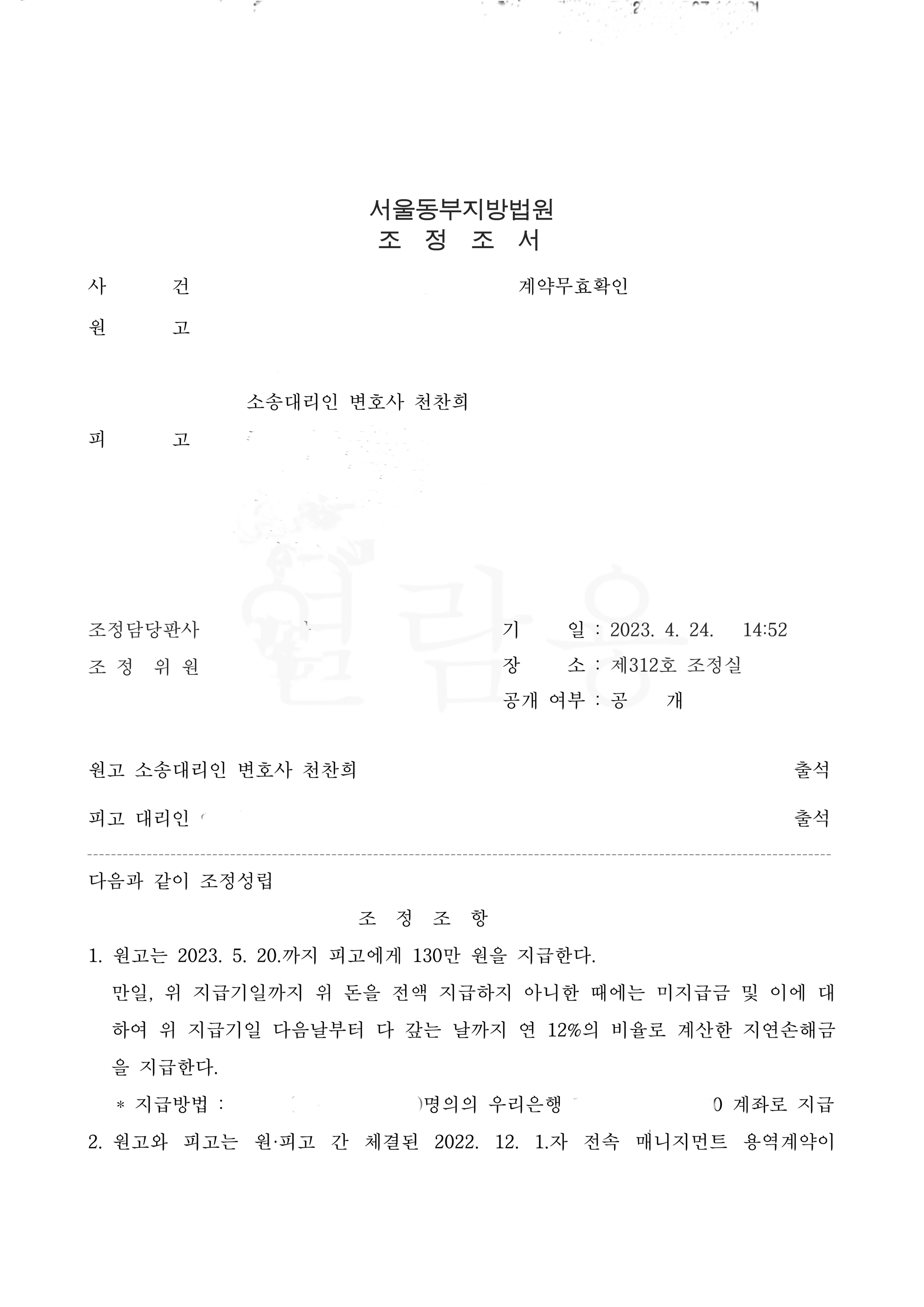 내용증명을 보낸 후 얼마 뒤 바로 소장을 접수하였고, 법원은 변론기일이 아닌 조정기일을 잡았습니다. 전속 계약 무효확인 소송은 쉬운 소송이 아니라 앞으로 많은 시간이 걸릴 거라 생각하였는데, 조정을 통해 해결하면 신속하게 법적 분쟁이 해결될 수 있어 나쁘지 않다고 생각하였습니다. 첫 조정기일에 상대방은 출석하지 않았으나, 저는 조정위원에게 다시 조정기일을 잡아 달라고 요청하였고, 다행히 두 번째 조정기일에 상대방과 만나 조정을 성사시켰습니다. 조정 당일 의뢰인이 아직 나이가 어려 제대로 계약서를 검토하지 못하였다는 것을 시작으로 최대한 위자료를 줄이기 위해 상대방을 설득하였습니다. 그러자 상대방은 계약서로 인정되는 위자료의 1/10에도 미치지 않은 금액인 130만에 합의하였습니다.