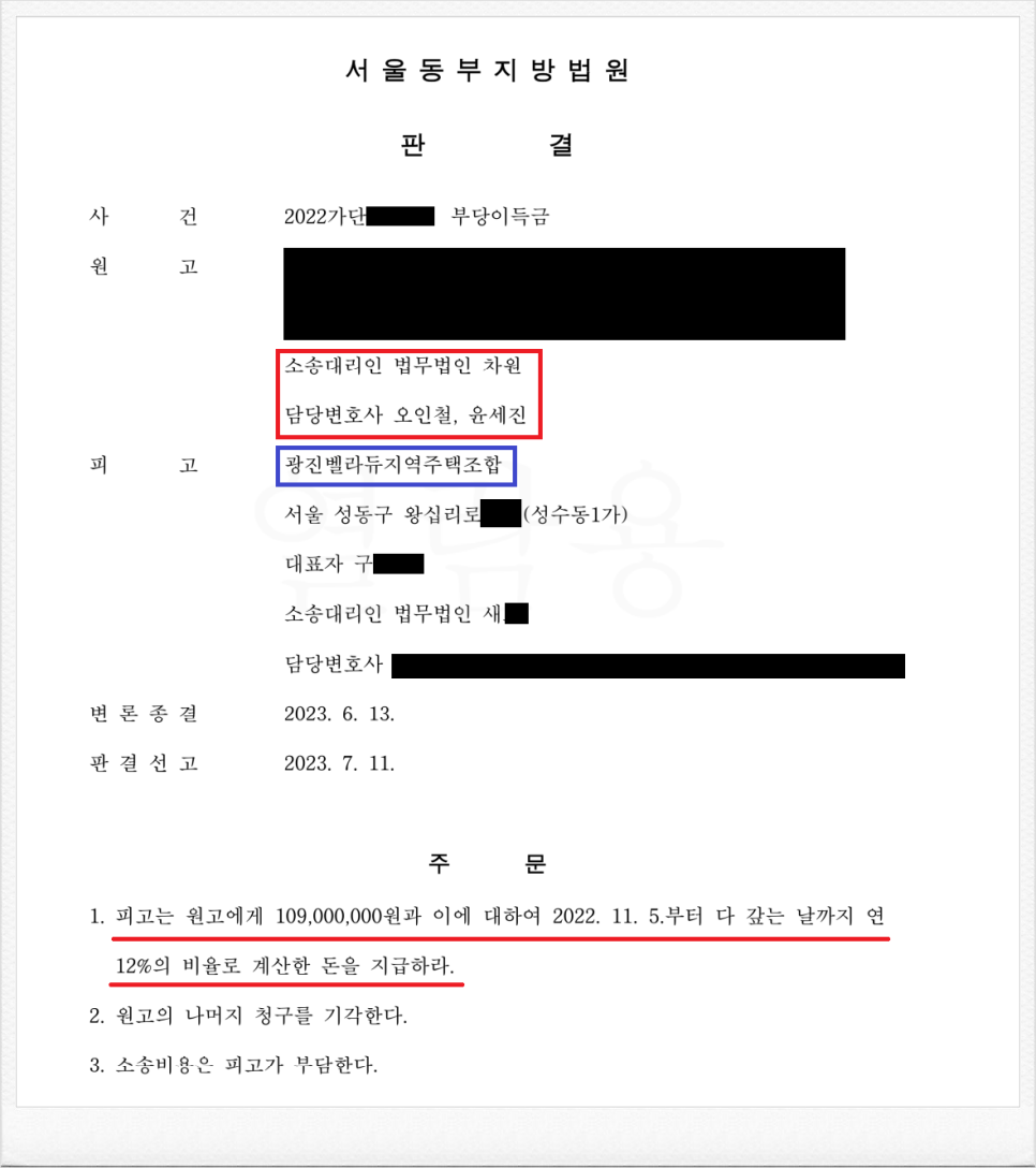 그러나, 가입 후 광진벨라듀 지역주택조합의 사업에 진전이 없자, 의뢰인은 정식 민사소송을 통하여 조합과 체결한 계약을 취소한 후 기 납입한 금원의 반환을 원하셨습니다.