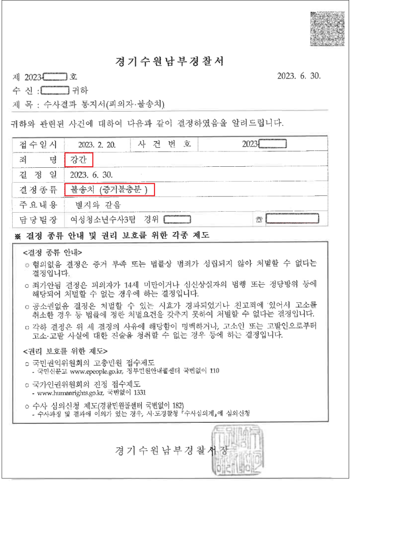첫 수사 단계인 경찰조사에서부터 적극적으로 대응한 결과 의뢰인의 강간혐의가 인정되기 어려워 검찰로 사건을 송치하지 않겠다는 결정을 았습니다. 의뢰인은 다행히 일상으로 돌아왔지만, 이러한 결정을 받기까지 참 오랜 시간을 고통에 시달려야 했습니다. 아직도 심적으로는, 여성은 물론 누구와도 쉽게 소통하고 만남을 가지는 것이 어렵다는 입장입니다. 그만큼 힘들었던 듯 합니다.
