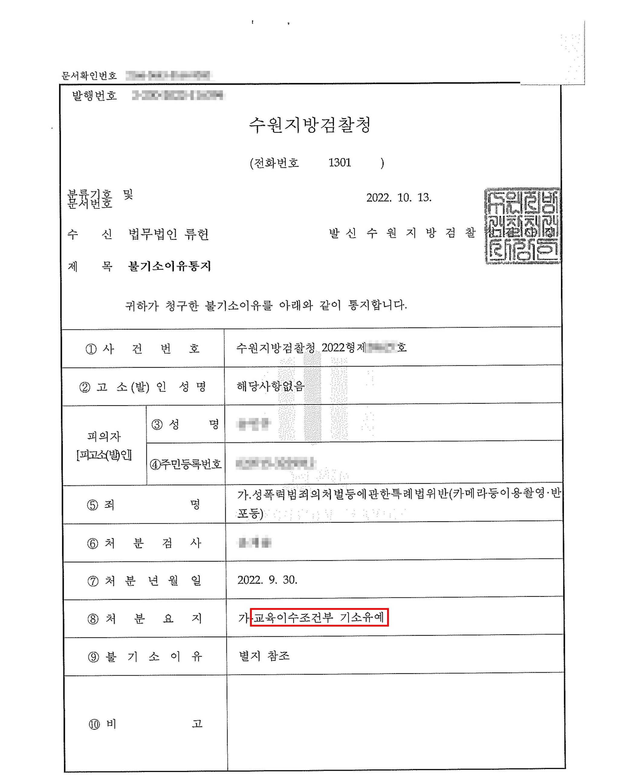 위와 같은 변호인의 주장을 받아들인 검찰은 의뢰인에게 교육이수조건부기소유예 처분을 내렸습니다. 이로써 의뢰인은 자신의 억울함을 풀 수 있었습니다.