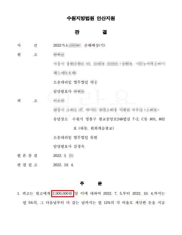원고 측에서는 의뢰인에게 위자료 30,000,000원 및 이에 대한 이자로 소장 부본 송달일 다음 날부터 다 갚는 날까지 연 12%의 이자를 청구하였으나 원고와 소외인인 직장동료 사이의 부정행위 정도, 피고가 원고와 소외인의 혼인 관계에 미친 영향 등이 고려되어 원고의 청구액에서 28,000,000원이 감액된 금액인 위자료 2,000,000원의 결과를 얻을 수 있었습니다.