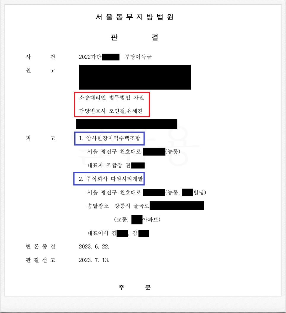 그러나, 가입 후 암사한강지역주택조합이 진행하는 사업이 계획대로 진행되지 않았고, 이에 의뢰인은 정식 민사소송을 통하여 조합과 체결한 계약을 취소한 후 기 납입한 금원의 반환을 원하셨습니다.