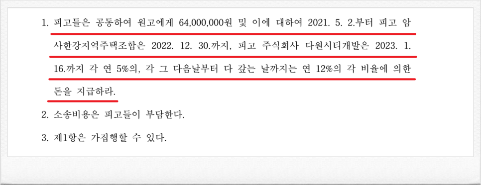 결국, 재판부는 이러한 저의 주장을 받아들였고, 피고들은 의뢰인에게 기지급 받은 금원 및 이에 대한 지연손해금을 지급하라는 내용의 판결을 이끌어 내었습니다.