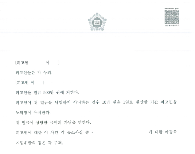 저는 즉각 재판 과정에서 이 사건의 경위, 아동학대 해당 여부, 상해 해당 여부 등을 중점적으로 주장 입증하면서 한편 검사 제출 증거가 위법수집증거임을 주장 입증하였고 법원은 이를 인정하여 무죄를 선고하였습니다.