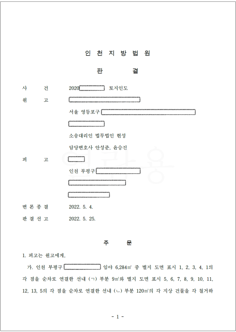 의뢰인은 부동산경매를 통해 인천에 있는 토지를 낙찰받았습니다. 해당 토지에는 별도의 건축물대장이 작성되어 있지 않았기 때문에 의뢰인은 권리에 아무런 하자가 없다고 판단하였고, 현장방문시 작은 가건물이 있기는 했지만, 이는 무허가건물이었기에 낙찰 이후 인도집행을 통해 쉽게 해결할 수 있을 것으로 생각했다고 합니다.