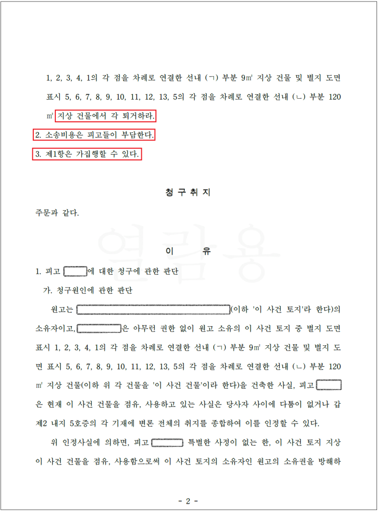 재판부는 가건물을 소유하면서 토지의 시효취득을 주장하는 상대방에게는 건물을 철거하고 해당 토지를 인도하라는 판결을, 또한 현재 거주자들은 가건물에서 전부 퇴거하라는 판결을 하였습니다.