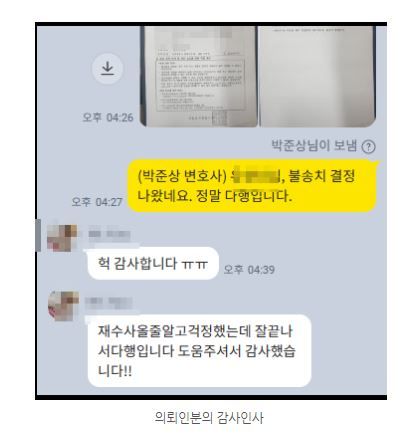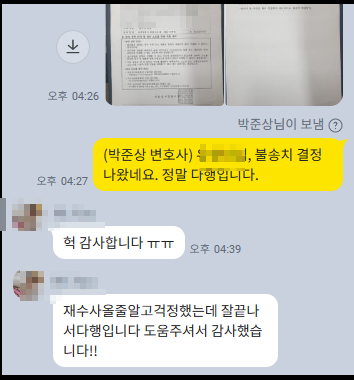 그 결과, 피의자 조사에서 의뢰인분은 저희와 연습하였던 내용을 그대로 수사관에게 잘 설명하며 설득하였습니다. 또한, 저희와 함께 준비한 노하우로 수사관의 심기를 건드리지 않고 긍정적인 인상을 심어 주는데도 집중하였습니다.