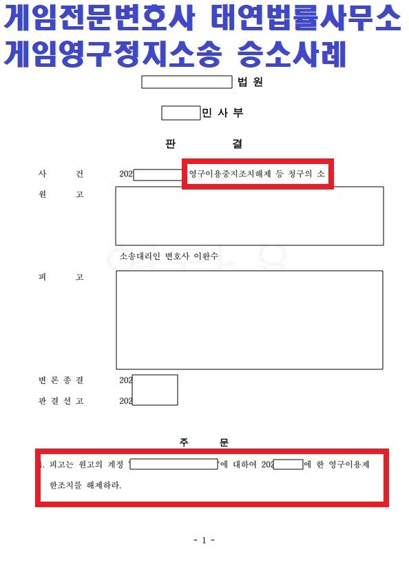 의뢰인의 게임계정 영구이용중지 사건은 의뢰인의 승리로 마무리되어 게임 계정의 영구이용중지 자체가 부당함을 법원으로 부터 인정받을 수 있었습니다!