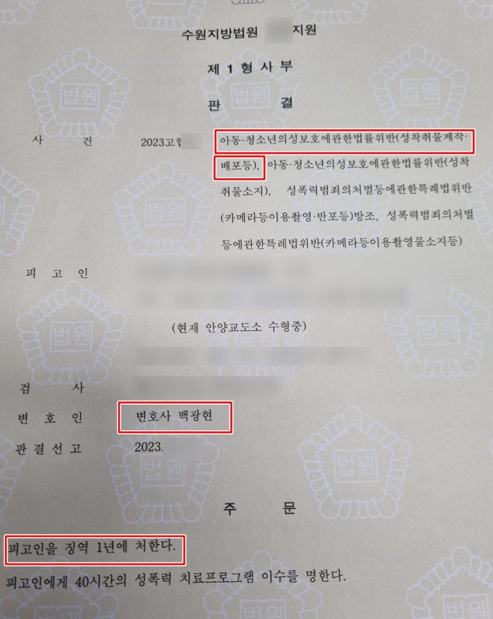 의뢰인의 아버님이 법률사무소 충용에 이 사건을 의뢰할 당시, 혐의를 모두 자백하며 징역 3년 정도로 막아달라고 부탁하셨었는데, 가장 중한 죄명인 아청법 성착취물 제작, 배포 죄는 무죄를 받고 다른 죄명들에 대하여도 정상참작 사유가 먹혀들며 최종적으로 징역 1년을 선고받는데 그쳤으니 정말이지 최상의 결과였습니다.