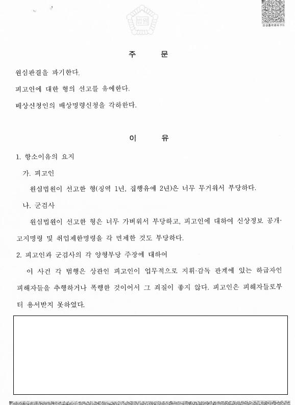 군검사도 양형부당으로 항소를 했지만 군검사의 항소는 기각되고, 피고인의 항소만 인용이 되었습니다. 이제 피고인은 그 죄값을 받았고, 군에서 제적이 될 것입니다. 다만 그동안 모아왔던 연금은 그대로 돌려받게 되었습니다. 저는 처음부터 피고인이 했던 행위는 이 정도의 처벌이 적정하다고 판단을 했습니다. 그리고 길지만 그 결과를 보게되어 너무나 기쁩니다. 그리고 제가 했던 판단이 서울고등법원 판사님들과 다르지 않다는 점에 안도감도 느낍니다.