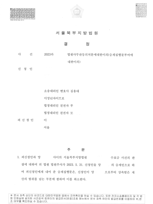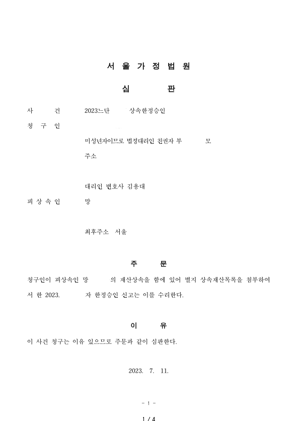 아래에서는 미성년자의 특별한정승인 및 승계집행문 이의신청 인용사례에 대해 말씀드리겠습니다.