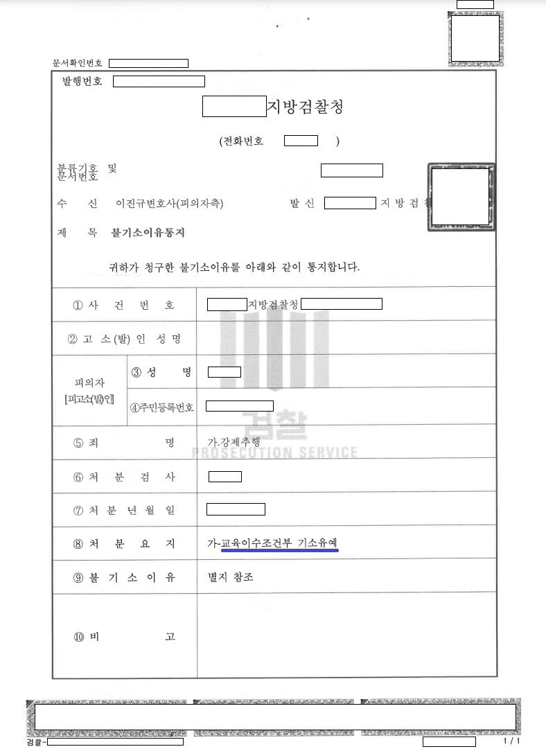 이 사건에서 담당 검사는 피의자(의뢰인)가 초범인 점, 피의자(의뢰인)와 피해자 사이에 원만하게 합의가 이루어진 점 등의 사정을 참작하여 의뢰인에게 교육이수조건부 기소유예 처분을 하였습니다.