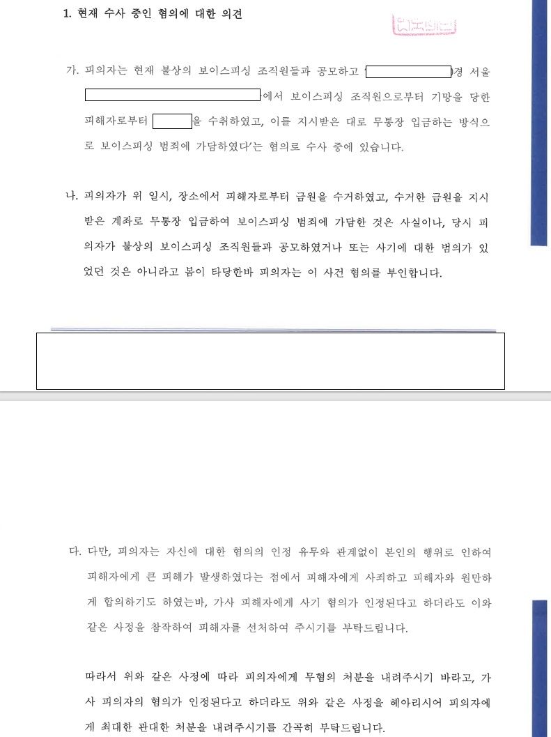 - 저는 의뢰인분과의 면담을 통하여 이 사건에서 의뢰인분께서 '보이스피싱에 가담하는 것인지 모르고 일을 시작하였다'는 점을 뒷받침 할 수 있는 여러 정황들을 확인하기 위해 노력하였고, 그와는 별도로 직접 피해자분을 찾아가 가해자인 의뢰인분을 대신하여 사죄드리고 원만한 합의를 이끌어 내었으며, 이후 주위적으로는 무혐의를 주장하고 예비적으로는 선처를 호소하는 취지의 변호인 의견서를 작성하여 검찰에 제출하였습니다.