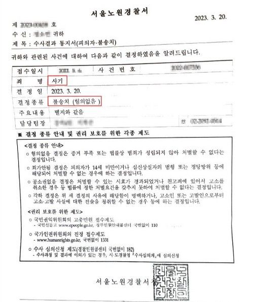 그런데 경찰에서는 이 사건을 송치하지 않고 불송치(혐의없음) 결정을 하였습니다.