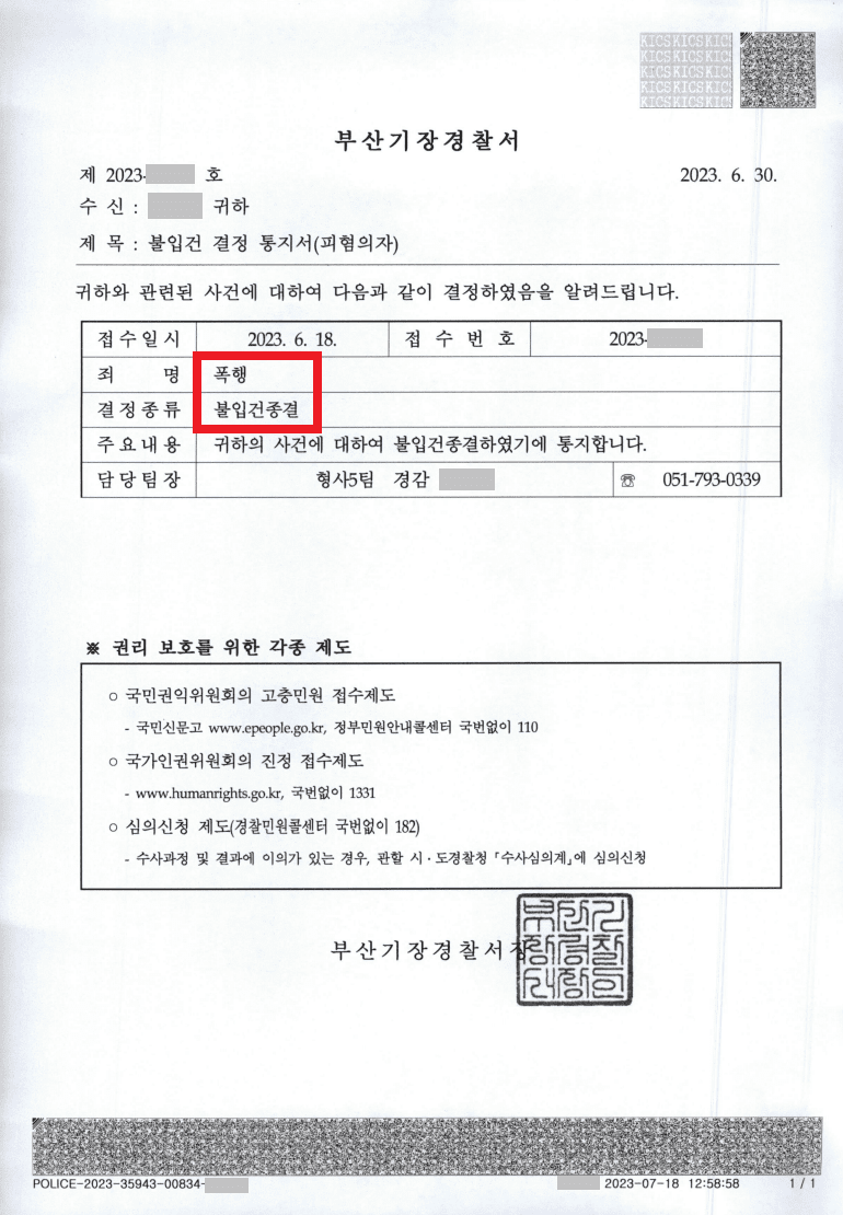 워낙 빠르게 합의를 보아 종결지은 사건이라, 일반적으로 폭행사건이 합의될 경우 '불송치결정(공소권없음)'으로 종결되는데 이 사건은 '불입건종결'되었습니다. 즉 수사자체가 개시되기도 전에 합의에 성공했다는 말이지요.