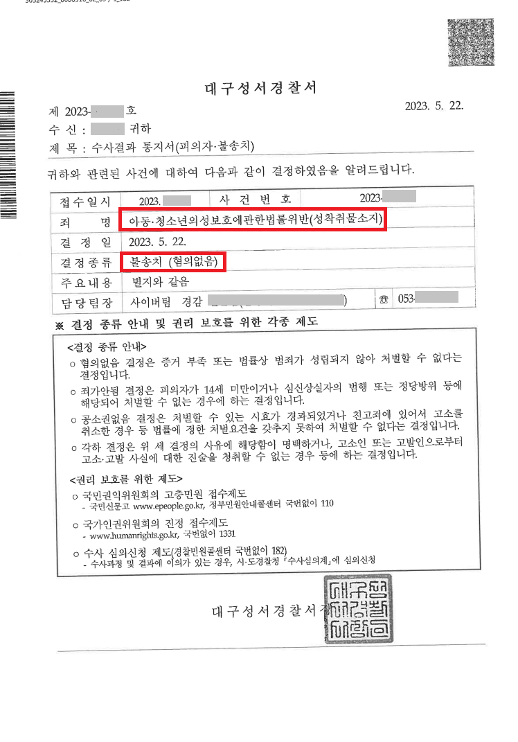 경찰단계에서 아청법 위반(성착취물 소지)이 불송치로 종결되는 경우는 극히 드뭅니다.