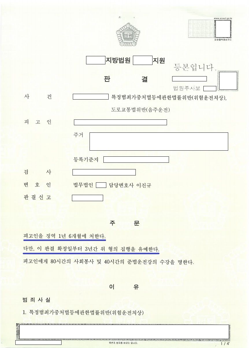 재판부는 변호인의 의견을 받아들이고 피고인(의뢰인)이 피해자 3명 모두와 합의하여 피해자들이 처벌불원의 의사를 표시한 점, 피고인이 음주운전에 이르게 된 경위에 참작할 만한 사정이 있는점 등 모든 양형조건을 참작하여 의뢰인에게 집행유예를 선고하였습니다.
