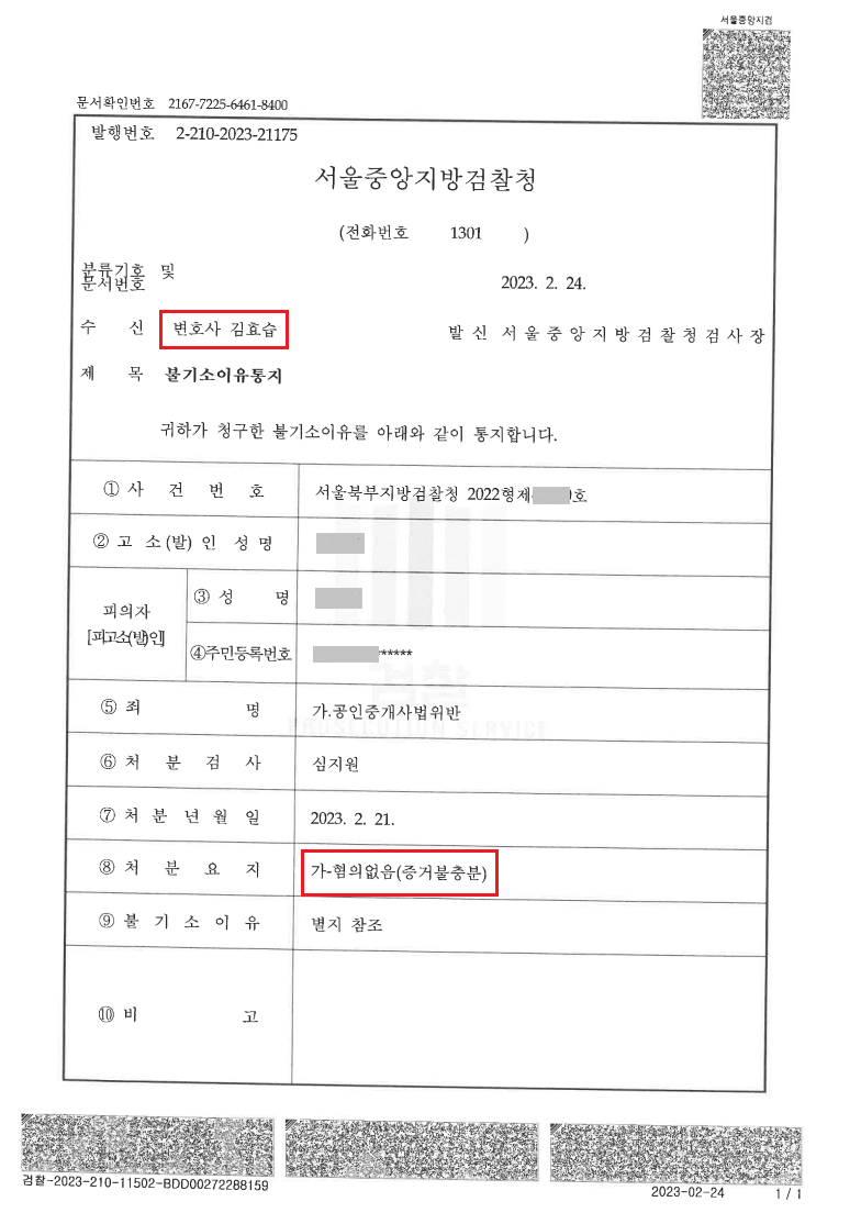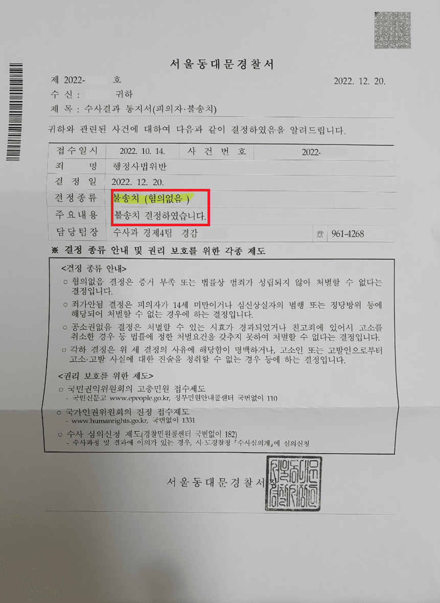 '행정사법 위반 - 불송치 결정'을 받았습니다.