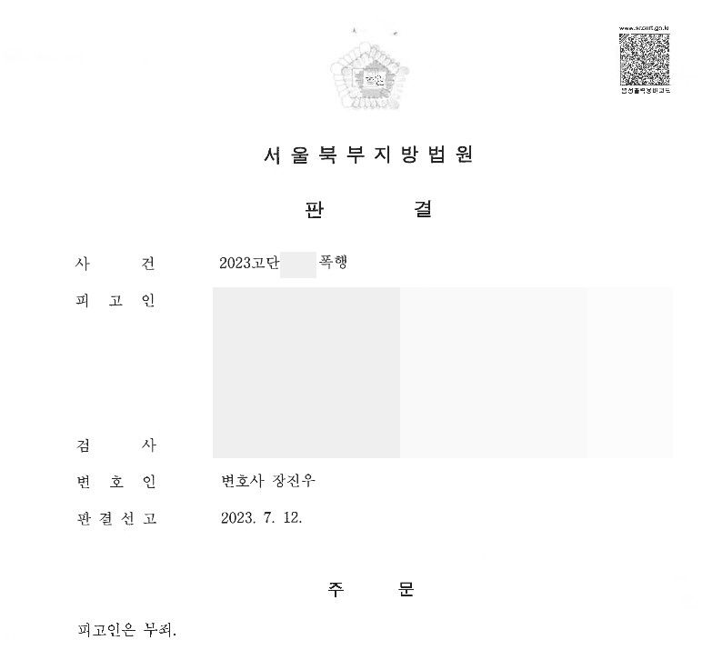 나. 의뢰인에게는 피해자를 폭행할 '고의'가 없었기 때문에, 폭행죄의 고의를 인정할 수 없어 무죄가 선고되어야 한다는 내용으로 변호인 의견서를 작성했습니다. 그리고 공판기일 당일에도 최후변론으로 그와 같은 점을 다시 강조했습니다.