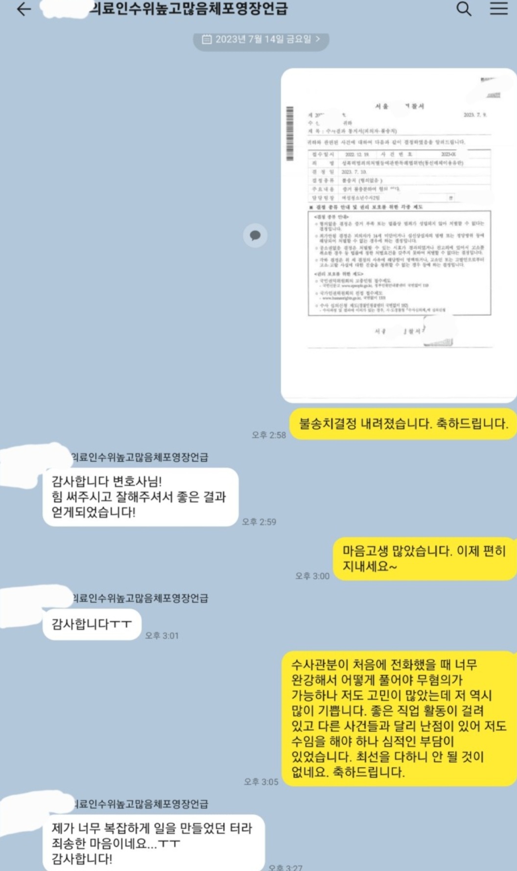 처음 수임할 때 무혐의 가능성이 크지 않은 것 같아 수임을 거절할 생각도 있었지만 한 가지 길이 열려 있다고 판단되어 변호를 시작하게 되었습니다. 확실히 무혐의를 받아줄 수 있는 사안은 아니었지만 어차피 의뢰인은 어떤 변호사의 변호라도 받아야만 하였고 그렇다면 통매음은 제가 가장 변호를 잘한다고 생각하기 때문에 맡아서 변호를 시작하였습니다. 의뢰인에게는 무혐의를 보장할 수는 없지만 최소한 취업제한은 막아주겠다라는 말을 하였습니다. 결과적으로 의뢰인에게 불송치결정이라는 기쁜 소식을 전달해줄 수 있었습니다.