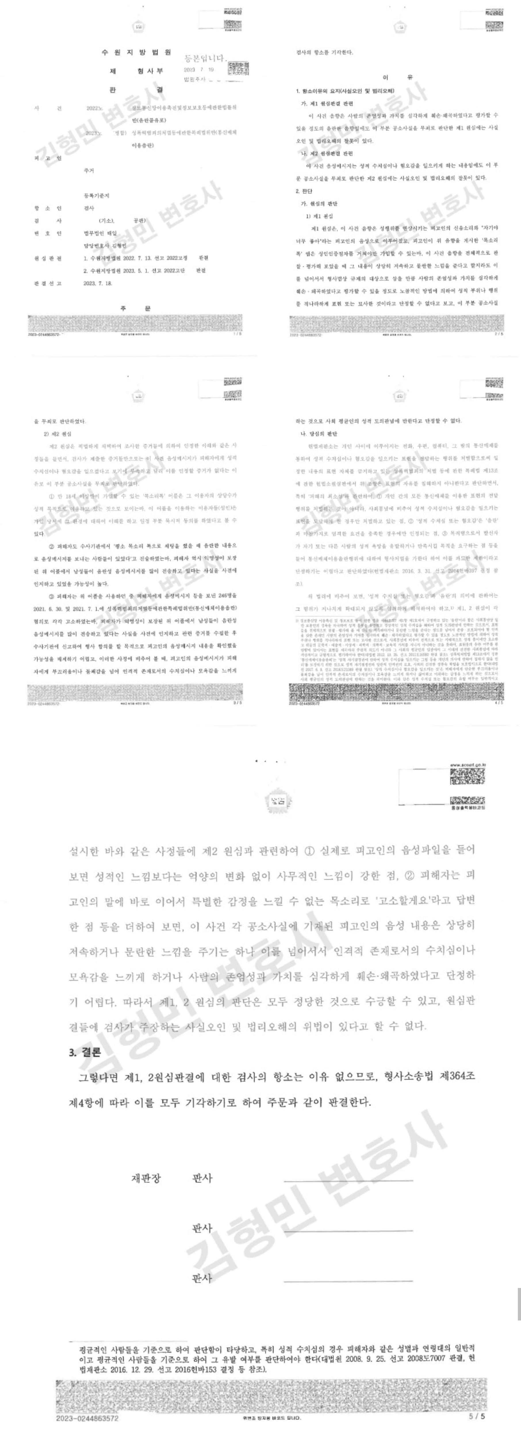 구체적인 내용은 위 판결내용에 나와 있는데 이미 제가 1심 판결 진행 중에 제출했던 의견서에 포함되었던 판례들을 차용하여 검사님의 항소를 기각하는 판결이 선고되었습니다.