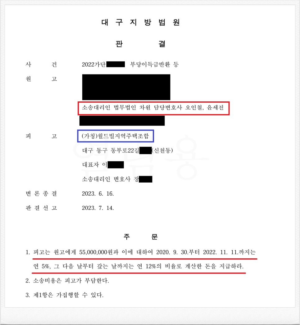 그러나, 가입 후 (가칭)월드빌지역주택조합이 진행하는 사업이 계획대로 진행되지 않았고, 이에 의뢰인은 정식 민사소송을 통하여 조합과 체결한 계약을 취소한 후 기 납입한 금원의 반환을 원하셨습니다.