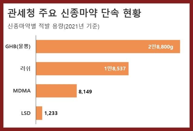 관세청은 2021년 밀반입하려던 물뽕(GHB) 2만 8,800g을 적발하였습니다. 이는 2020년에 비해 61배 급증한 수치인데요, 1년 사이 엄청난 양의 마약이 시중에 유통되어진 것이라 할 수 있지요.