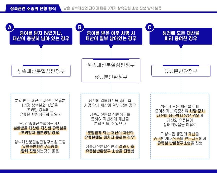'피상속인이 생전에 일부 재산을 증여하고, 사망 당시에 일부 재산이 있는 경우'에는 상속재산분할심판청구와 유류분반환청구를 같이 진행해야 하는 경우가 많습니다.
