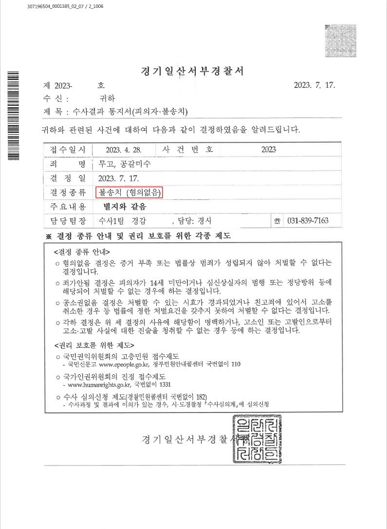 다음과 같이 경찰 불송치결정에 반영되었습니다.