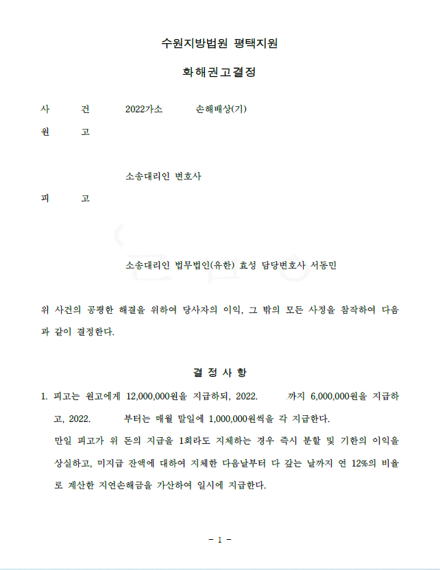 저는 즉각 청구이의의 소 및 강제집행정지신청을 함과 동시에 위 소송에 응소하여 최대한 원금 이하로 합의하기로 노력하여 법원은 원금보다도 적은 금액을 지급하는 내용의 화해권고결정을 내려 확정되었습니다.