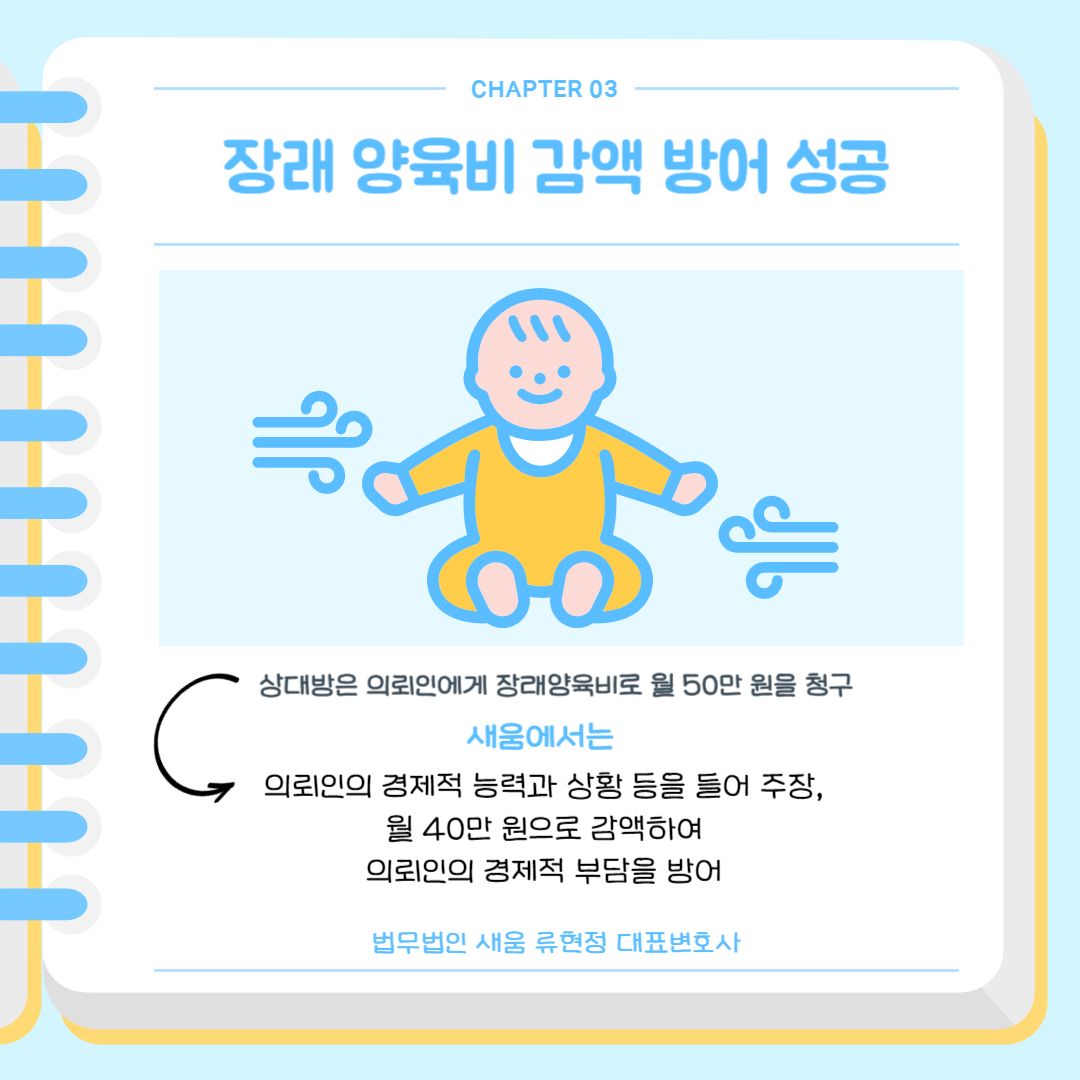 또한 상대방은 의뢰인에게 장래양육비로는 월 50만 원을 청구하였는데요. 이 역시 의뢰인의 경제적 능력과 상황 등을 들어 주장한 결과 월 40만 원으로 감액하여 의뢰인의 경제적 부담을 방어할 수 있었습니다.