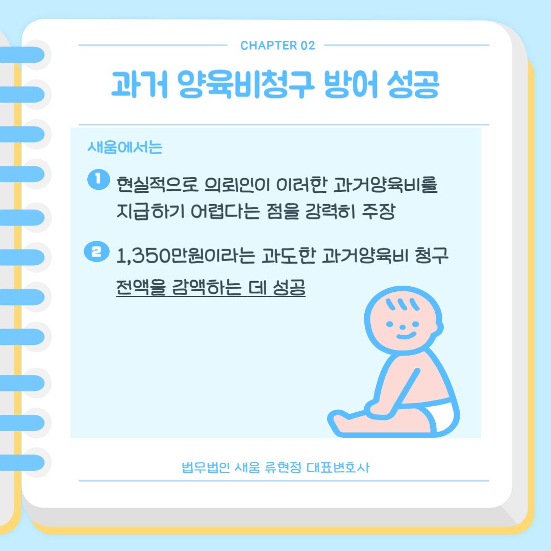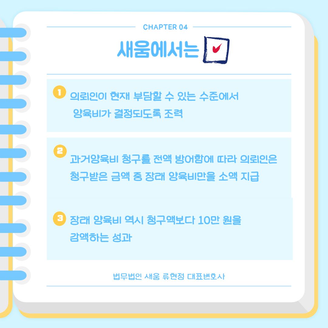 결과적으로 새움에서 과거양육비 청구를 전액 방어함에 따라 의뢰인은 청구받은 금액 중 장래 양육비만을 소액 지급하게 되었으며, 장래 양육비 역시 청구액보다 10만 원을 감액하는 성과를 이끌어내면서 의뢰인의 부담이 없도록 조정안을 이끌어낼 수 있었습니다.