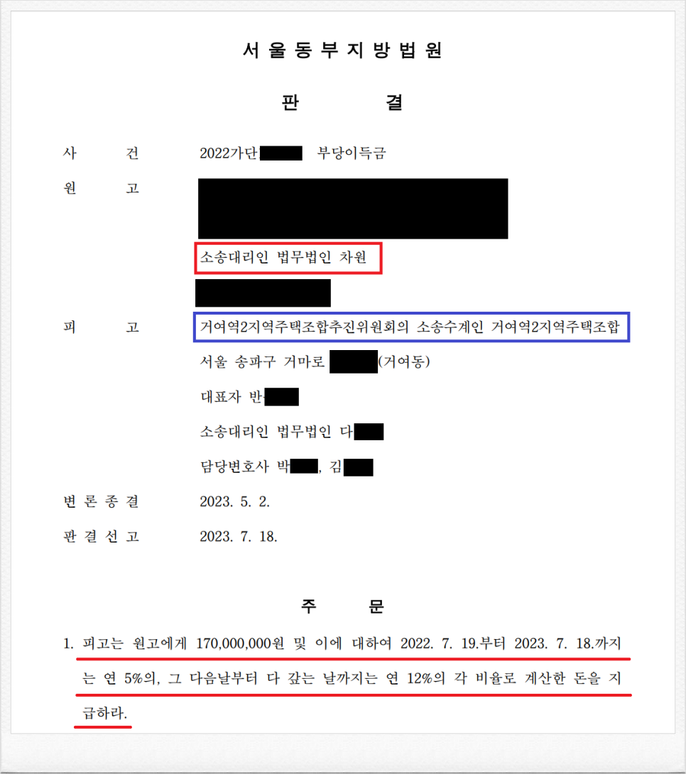 그러나, 가입 후 거여역2지역주택조합 추진위원회의 사업이 계획대로 진행되지 않자, 의뢰인은 정식 민사소송을 통하여 조합과 체결한 계약을 취소한 후 기 납입한 금원의 반환을 원하셨습니다.