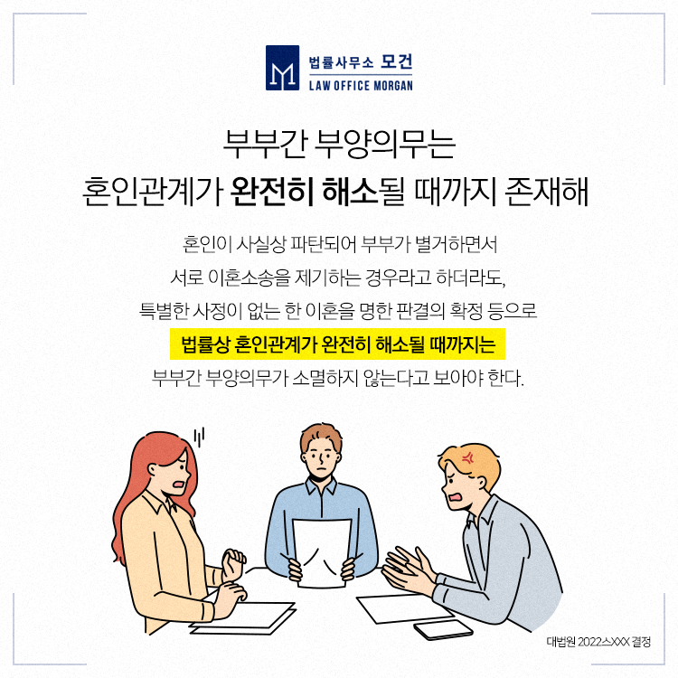 따라서 혼인이 사실상 파탄되어 부부가 별거하면서 서로 이혼소송을 제기하는 경우라고 하더라도, 특별한 사정이 없는 한 이혼을 명한 판결의 확정 등으로 법률상 혼인관계가 완전히 해소될 때까지는 부부간 부양의무가 소멸하지 않는다고 본 것입니다(대법원 2022스xxx).