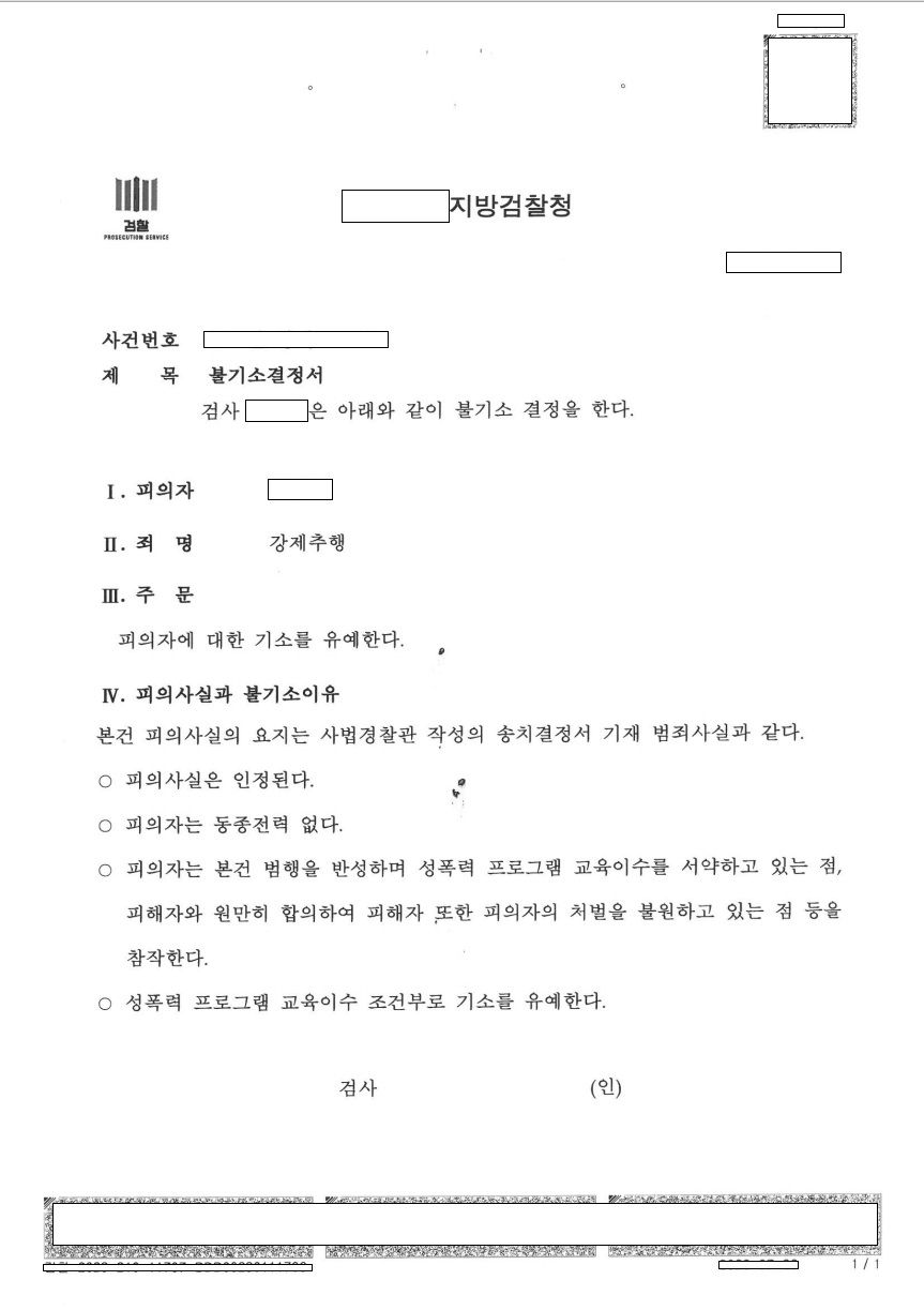 이 사건 담당 검사는 피의자(의뢰인)에게 동종의 전력이 없는 점, 피의자(의뢰인)와 피해자 사이에 원만하게 합의가 이루어진 점 등을 참작하여 의뢰인에게 기소유예 처분을 하였습니다.