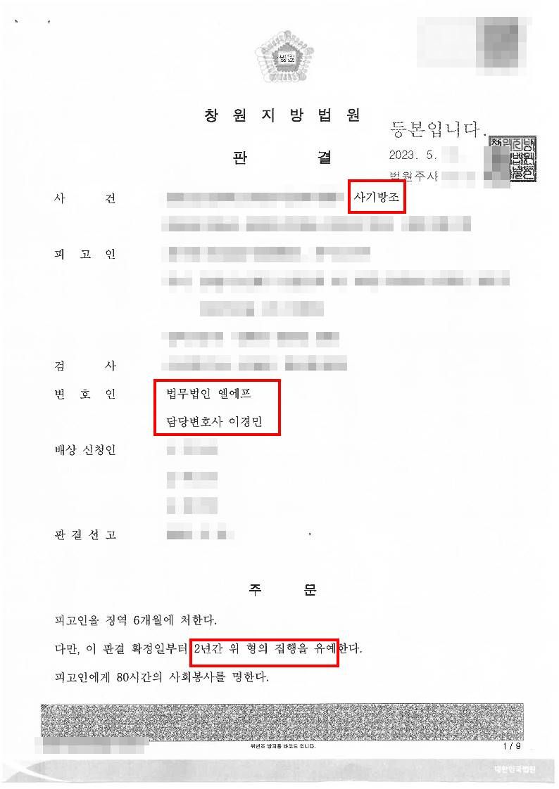 │LF는 피해자들의 피해회복을 위하여 합의 절차를 진행하였으며 원만한 합의를 통해 피해자들로부터 처벌불원의사를 받을 수 있었습니다. 또한 의뢰인이 범행을 인정하고 반성하고 있음과 의뢰인이 처한 환경을 적극 변론하며 재판부의 선처를 구하였습니다.