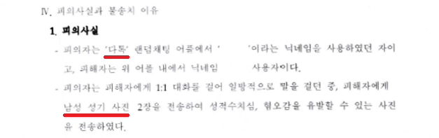 A씨는 랜덤 채팅 어플리케이션 '다톡'에서 전혀 모르는 여성 B씨에게 대화를 걸면서 다짜고짜 성기 사진 2장을 전송하였습니다.