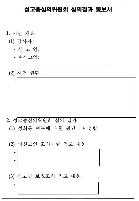 - 따라서 성고충심의위원회 결정에 대한 불복은 이후 징계절차 또는 형사절차에서 개별 절차에 따른 소명이나 다툼이 가능할 뿐입니다. 그래서 어떤 측면에서는 성고충심의위원회의 결정이 중요하다고 보입니다.