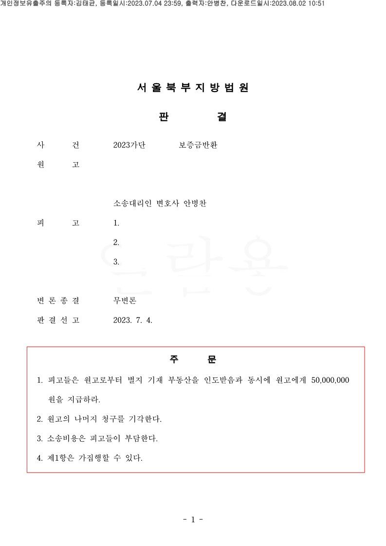 변호인은 보증급반환청구소송 진행하여 승소 후 변호사 비용 전액, 이사 후 이자 전액 등을 받아냈습니다.